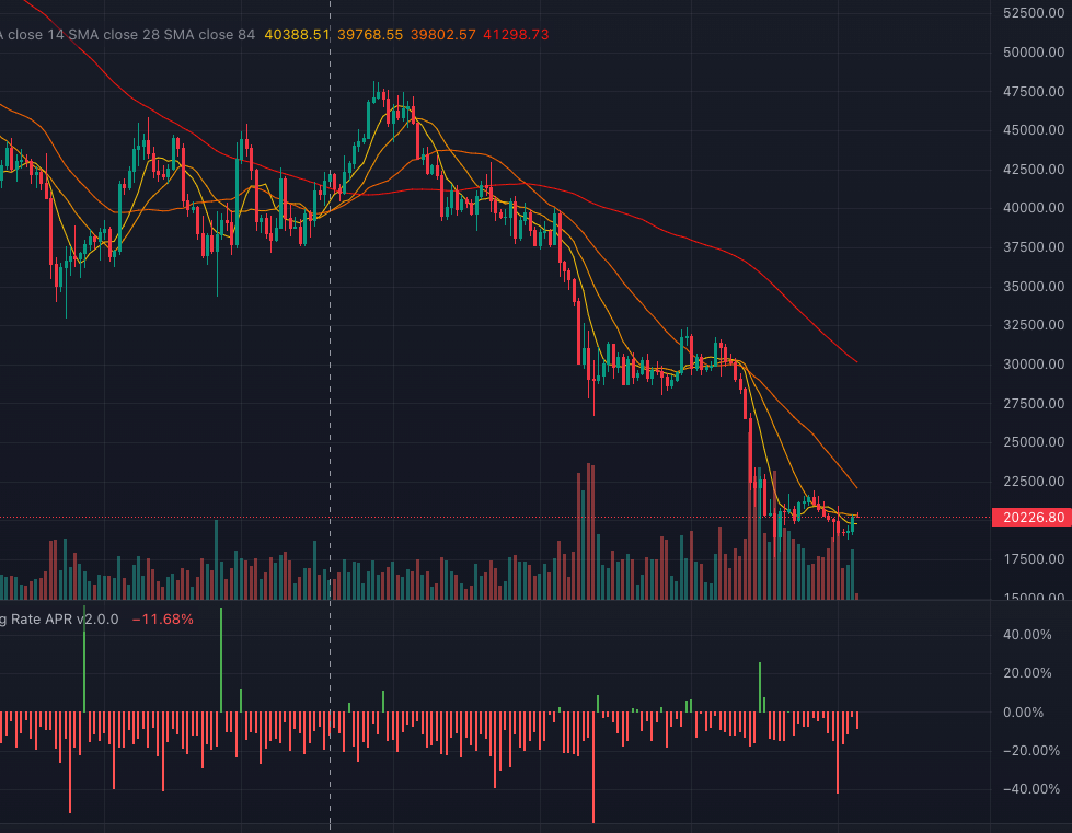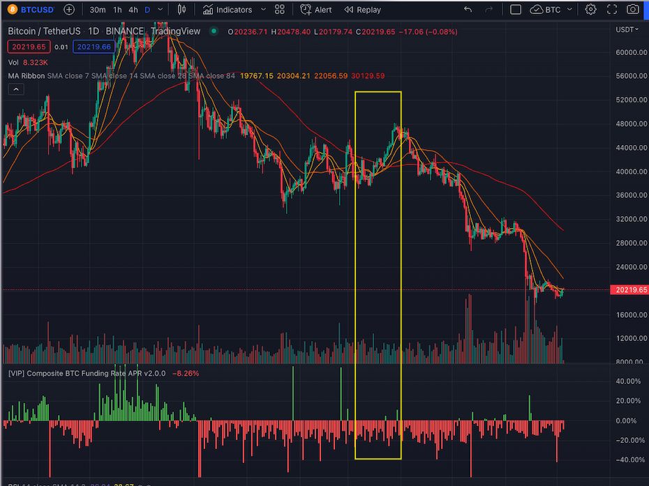 2022년 3월 정도에 단기적인 (약 2주간의) 불장이 나왔었던 적이 있었다.(아래 사진에서 노란 박스에 표시된 구간이다.) 만약 Funding Rate가 단기적인 지표라면 이때 시장은 과열로 인식하고 Funding Rate는 양수가 되어야 하는데 결과는 다음과 같았다.